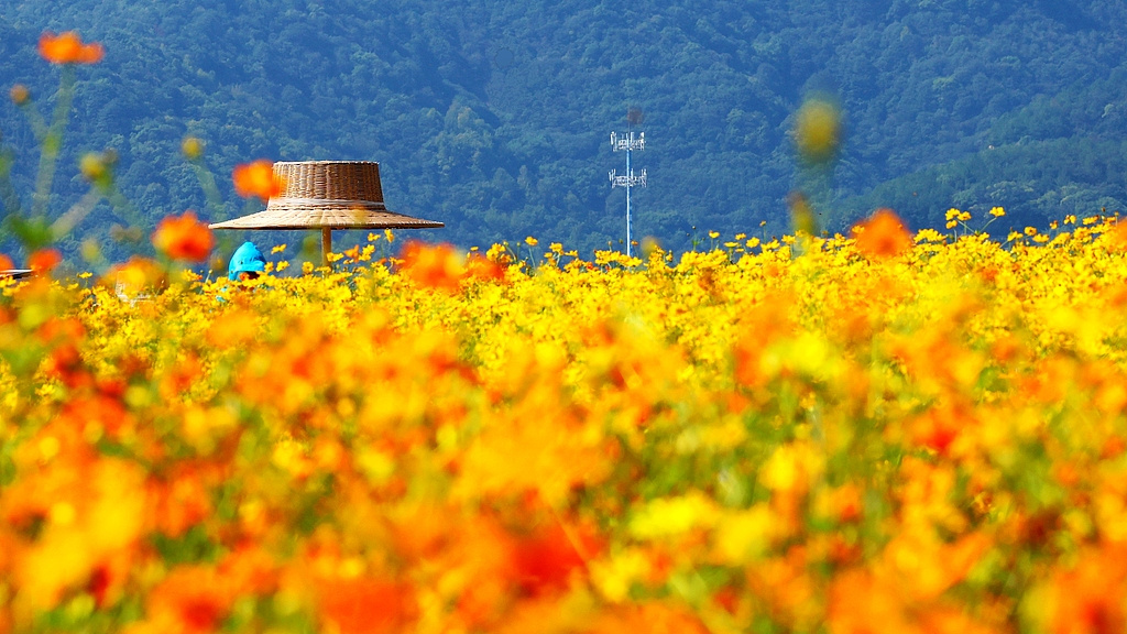 On October 2, 2025, the sea of flowers in Tongjian Lake in autumn is picturesque, and the large sea of flowers is like a fairytale world. Various flowers such as cosmos, sunflowers, thousand days red, and fragrant colorful finches have covered Tongjian Lake with colorful clothes.