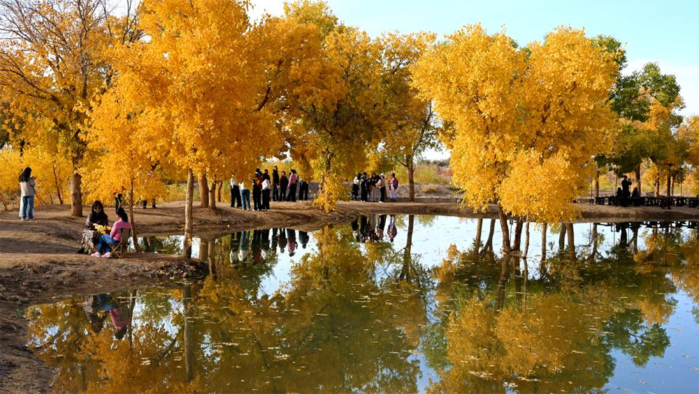 In the golden autumn of October, the Populus euphratica forests in many places in Dunhuang, Gansu are rendered by autumn colors, attracting tourists to come and enjoy the scenery and check in to take photos.
