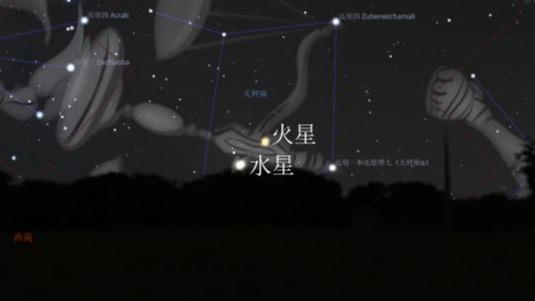 10月21日将迎水星合火星。当天日落后,水、火两星将“携手”出现在西南方低空,我国公众有机会看到水星、火星一明一暗“同框”的“星空约会”。