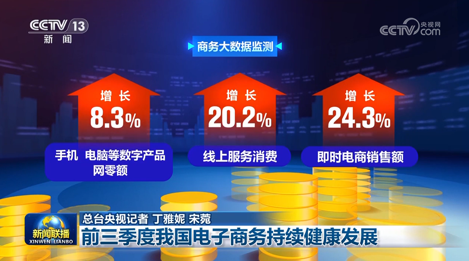 The reporter learned from the Ministry of Commerce that in the first three quarters of this year, my country's e-commerce continued to develop healthily, among which online retail stimulated consumption vitality. 1-9 In September, digital products, online services, and instant e-commerce became highlights, with increases of 8.3%, 20.2%, and 24.3% respectively.